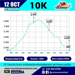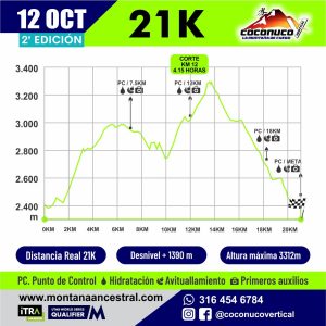 D3.- Definición de la rutaCoconuco Trail es una carrera que abarca distancias de 10, 21 y 30 kilómetros. La competencia contará con un punto de partida, varios puntos de control y un punto de llegada. La ruta estará marcada con cintas y flechas visibles cada 200 metros, además de contar con guías en los puntos de control y en los cruces. Todos los corredores deben seguir estrictamente el sendero señalado. El Director de Carrera se reserva el derecho de realizar cambios en el trazado, los cuales serán anunciados a los corredores antes de la partida o en un punto de control. Estas modificaciones se llevarán a cabo para garantizar la seguridad de los competidores y optimizar el tiempo de la competencia.