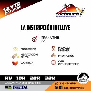 D3.- Definiciónn de la ruta – Coconuco Vertical es una carrera de — distancias (KV, 10, 20, 30 kilómetros). La competencia incluye un punto de partida, puntos de control, y un punto de llegada. La ruta será marcada con cintas y flechas visibles para los corredores cada 200 metros, ademáss de guias de rutas en los PC y cruces. Todos los corredores deben seguir el sendero marcado. El Director podrá hacer cambios al trazado de la competencia anunciándolo previa la partida a los corredores o en un punto de control. Esta medida se tomará en función de parametros necesarios para preservar la seguridad de los competidores y el tiempo de competencia.